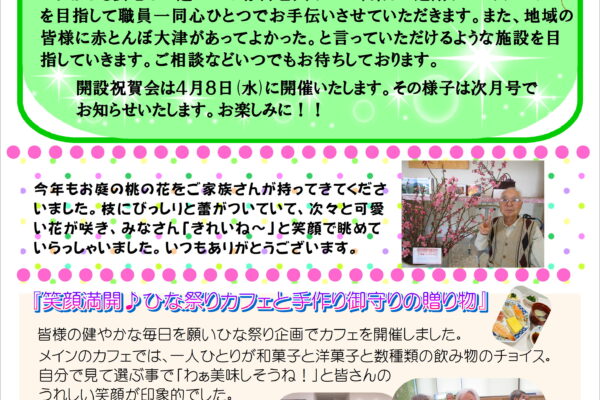赤とんぼ長嶺「あかなが通信3月号」を発行しました。 表面には、2月の企画の節分(豆まき)の様子を掲載...