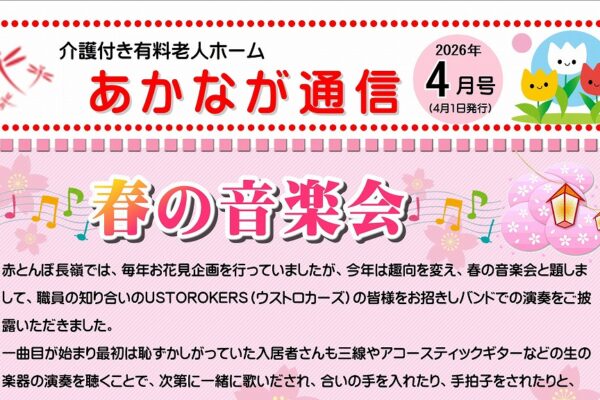 赤とんぼ長嶺「あかなが通信4月号」を発行しました。 3月企画の「春の音楽会」の様子を掲載しています。...