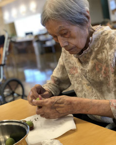 梅シロップ作りをされたのは、なんと102歳と107歳、平均年齢約105歳の利用者さん。超高齢メンバーでの料理教室開催でした。当初はもう1人、100歳代の利用者さんの参加を予定していましたが、当日は残念ながら参加ならず。100歳代女子のトリオでの料理教室の夢は叶いませんでした。