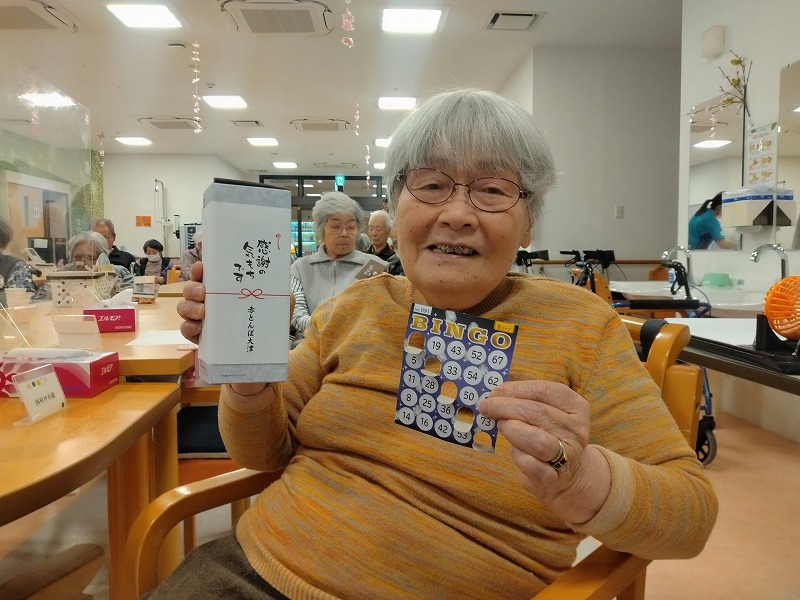盛り上がりが最高潮の中、ビンゴ大会の始まりです。ビンゴカードの番号が読み上げられる度に一喜一憂!「その番号はなか」「あった、あった」等、日ごろのリハビリ以上に真剣に取り組まれておられました。