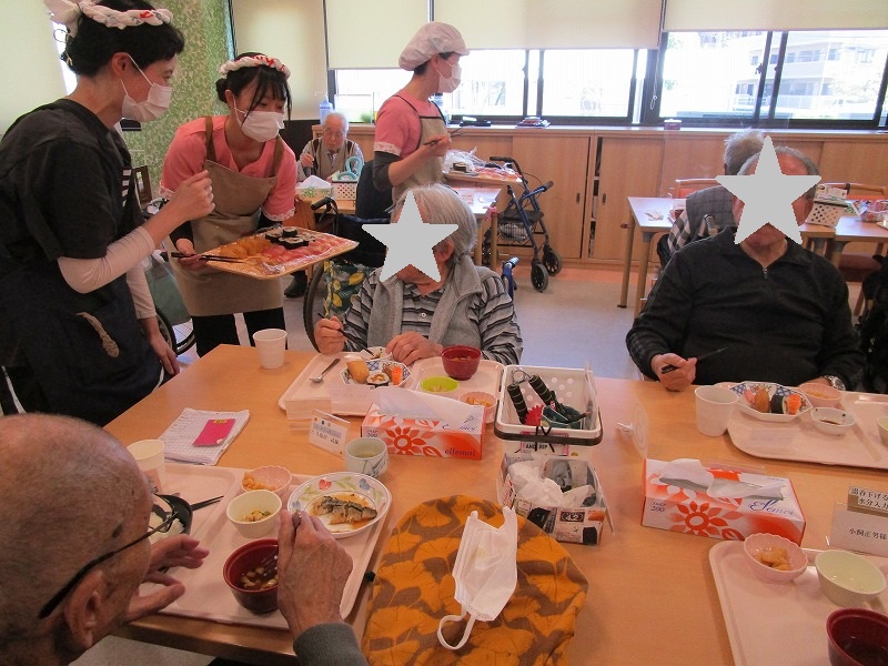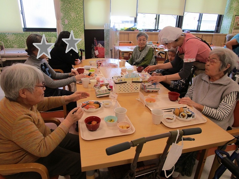 祝賀会前のお昼にはマグロや穴子などの握り、稲荷寿司、手巻き寿司を提供しました。好きな寿司を沢山召し上がっておられ、皆様「美味しい」と喜ばれておられました!