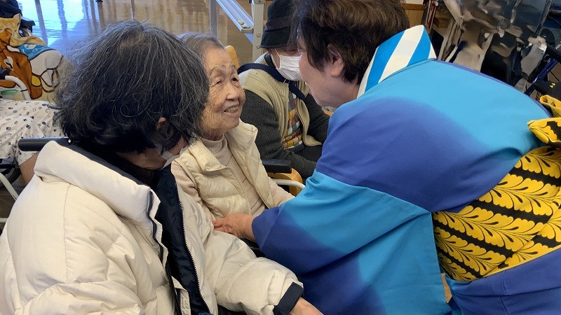 前年度に来ていただいた時にはY先生からの桃の会の踊りの評価は80点でしたが、 果たして今回は…? 「うーん…95点!!」 前回よりも15点も上がっておりました! 厳しいと評判だった先生の高得点に満足しつつも、お弟子さん達は残りの5点が気になる様子。 「来年はあと5点をふやせるよう頑張ります!だから長生きしてくださいね!」 と、声をかけ、 家族を含めしばらく楽しい時間を過ごした後、牛深へと戻って行かれました。 今回は、入所フロアだけではなく、通所フロアでも披露していただき、こちらの利用者さんたちも大変盛り上がりました。