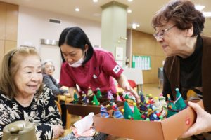 赤とんぼ通所リハビリテーションの利用者さんが、巧緻動作訓練の一環として、毛糸のミニツリーとガーランドを作りました。