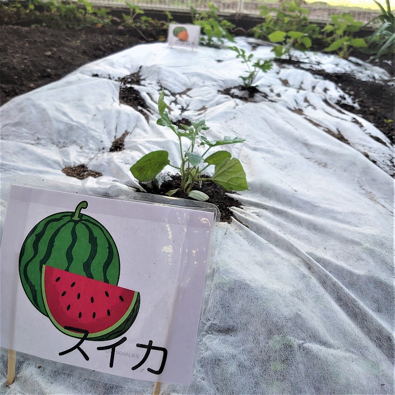さっそくスイカが成長してきており、今日は元スイカ農家のSさんに、より元気なスイカを育てる摘芯(芯止め)を教わりました。畑でとれた大きなスイカで夏祭りにスイカ割りをするべく、スイカ作りには気合いが入っております!