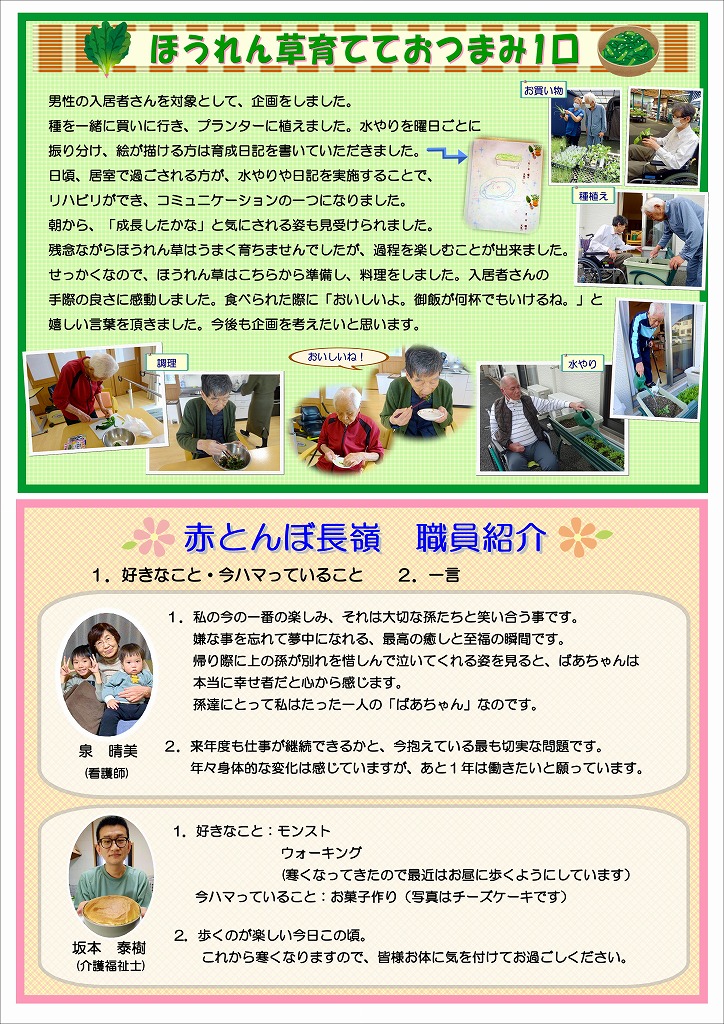 表面には、11月に開催しました秋を楽しむ企画や裏面には、ほうれん草を育てる様子、赤とんぼ長嶺の職員紹介を掲載しています。