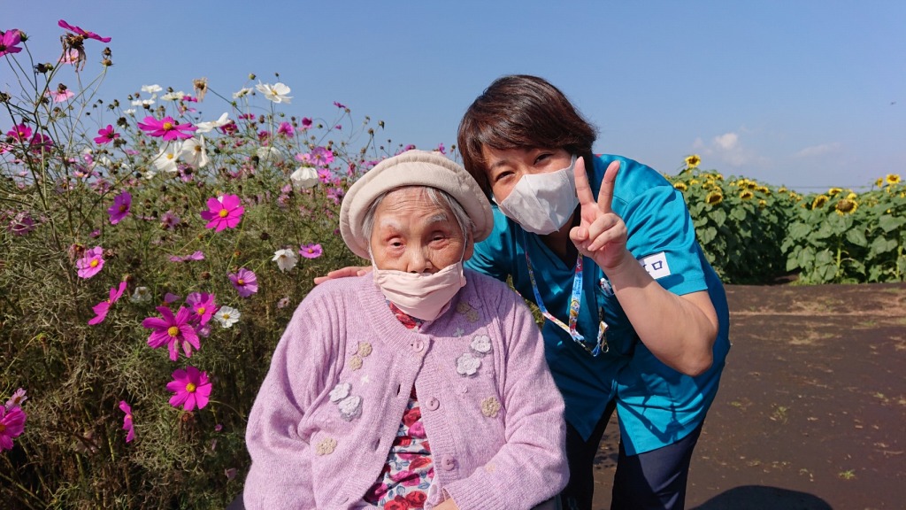 ドライブは、皆さんに希望を聞いたら、「お花を見たい」という方が多く、旭志の道の駅のひまわりとコスモス見学に決定!道中、久しぶりに通った利用者さんからは、「こんなに店や建物も変わってしまったなあ、昔は何もなかったのに」と、話されていました。