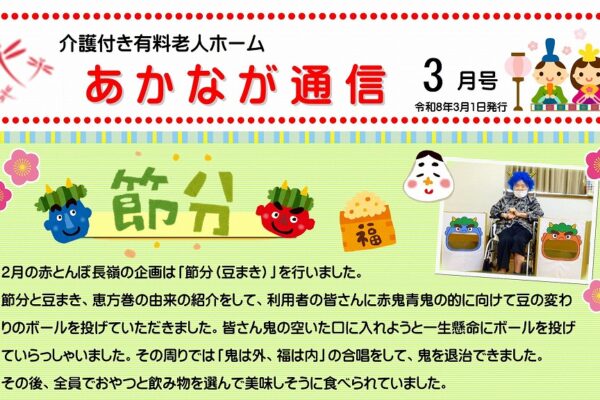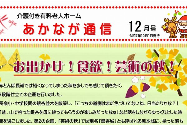 赤とんぼ長嶺「あかなが通信12月号」を発行しました。 表面には、11月に開催しました秋を楽しむ企画や...