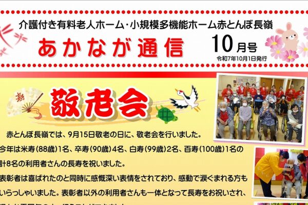 赤とんぼ長嶺「あかなが通信10月号」を発行しました。 表面には、9月に開催しました敬老会や裏面には「...