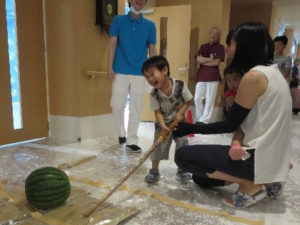 ステージではコーラ早飲みや抽選会、スイカ割り。なかなか割れないスイカにドキドキしながら歓声が上がっていました。子供たちの笑い声にも元気をもらいました。