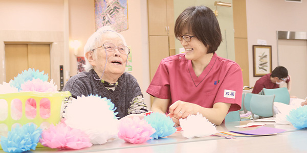 リハビリテーション科は、理学療法士、作業療法士の二つの専門職に加え、介護予防運動指導員、健康運動実践指導者の有資格者がいる部署です。これらの職種が互いに協力し合うことで、ご利用者様のフィジカル面、コグニティブ面の維持向上を図っています。また、電子カルテの導入を期に、ケアマネージャーや看護職や介護職の職員とも、よりタイムリーな連携が強化できるよう、ICT導入にも積極的に取り組んでいます。